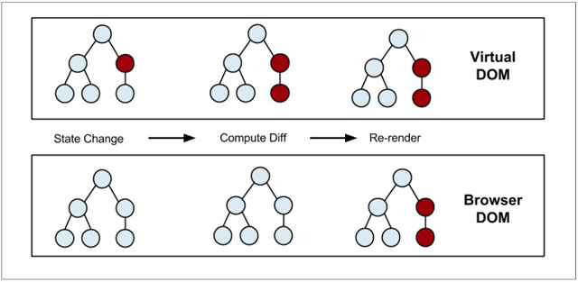 在 React里,虚拟的文档对象模型是一个中间层:开发者描述清楚了网页的元素看起来应该是怎样的, 然后虚拟的渲染模块根据这些描述生成页面。为了渲染在浏览器里的用户界面的互动组件,程序员需要修改浏览器的文档对象模型。 这一步的代价很大, 过度的重写浏览器的文档对象模型会对网站的性能有很大的影响。 React 不会直接渲染页面上的被修改过的组件,他会根据内存里的文档对象模型进行计算已存在于页面上的修改差值,然后只重新渲染最小量的应用程序的变化。