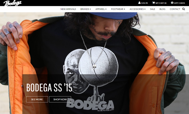 Bodega 就是一个很实用的,且可以效仿的电商平台设计例子。下拉式的导航栏设计,利用清晰的链接和清新的文字让网站简单直接。相对于要跳离该页面的链接文字则都用重彩字体突出。