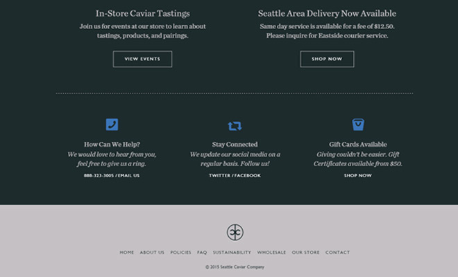Seattle Caviar Co. 就是一个非常整洁的页面布局,在该页上放置了些对比度很强烈的元素做为用户的焦点。导航菜单能立刻抓住您的注意力并吸引您更进一步的探索整个网站。 而每一个内部页面主要就是依赖内容而无其它一些过多的属附。