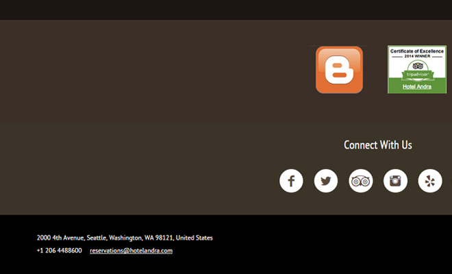 Hotel Andra Website 在网页页脚放置了联系信息包括了直接的地址,电话号码,以及电子邮件等信息给预订酒店的客人们。 大多数的小型企业都会把这些联系信息放置在页脚,因为这是一个传统的设计方式。 当然您也可以把这些信息放置在任何您想放置的地方并能够让其明显的展示出来。