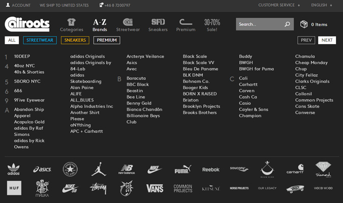 我们以Caliroots为例来看一个主页这个顶栏的导航设计,带着图标和文字标签。 鼠标悬浮在任何一个链接上时,都会动态的出现一个下拉菜单,里面展示出来更多的相关信息。 这些“品牌”的下拉菜单甚至还有向前向后翻的链接,以方便用户在不同的品牌列中跳转。 这样菜单就不会显的很参差不齐。