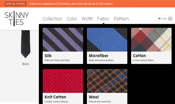 对于 Skinny Ties 的导航,他们也是给每个主要的链接都设计了一个下拉列表。 让我特别惊讶的是,他们的页面布局已经完全是响应式的了,无论您的屏幕分辨率是多大,该网站的下拉式菜单都会尽力去适应。 不同的技术适用于不同的网站,所以我们可以借鉴下别人的网站看看其他设计师都做了哪些特别的工作以解决这些实际的问题。