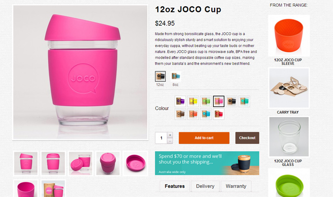 我非常喜欢 JOCO Cups 网站的商品详情页面,因为这里的设计兼顾了功能性以及审美的层次。 背景纹理以及按钮都能很好的和网站整体设计匹配。 但同时该页面的设计又不会很抢眼的夺去来访者的注意力,就算是个十来岁的小朋友也可以毫无困难的完成整个购买流程。
