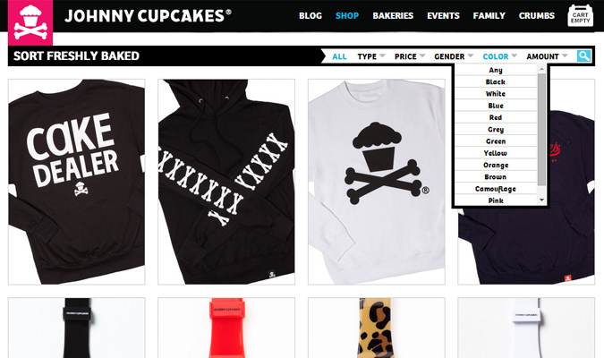 在 Johnny CupCakes的网站里,您可以找到一个关于服装类的分类以及服装类的配件。 在网页呈现出所有的产品列表之前,您就会注意到页面上那个带有排序选项的横条,可以让您通过类型,价格,性别等进行排序。 因此用户就可以很方便的将其要找到产品定位在所有 20美刀以下的女性衬衫-精确又非常有用的功能。