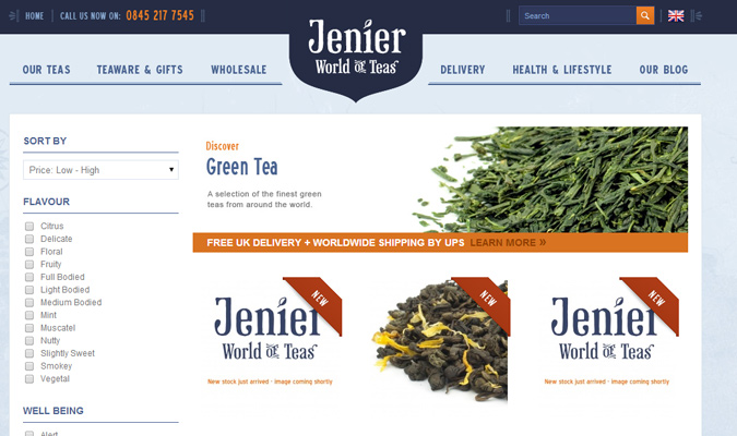 我们可以在 Jenier World of Teas 网站上面找到另外一个很好的例子,不同于我们前面提到那些用下拉式菜单,这个网站是把每个带有完整列表的过滤器放在网面左栏里。用户只要轻点这个文本框,页面上的产品就会根据选择自动更新展示。使用超级简单,而且还略让人有点小兴奋的功能。