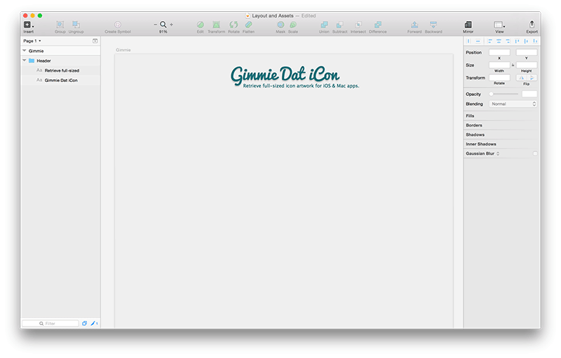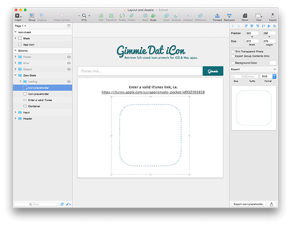请注意,当前的图标占位符图片没有找到。 返回到 Sketch 的设计原稿里面,很容易就可以扔该图片生成 SVG 格式以供我们程序使用。