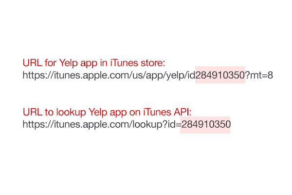 现在我们举点例子,比方我们现在通过iTunes ID来查找 Yelp 软件应用程序:https://itunes.apple.com/lookup?id=284910350. 特别注意一下这些链接里面的应用程序ID 数字。这些链接就是我们需要客户在输入框中输入的。