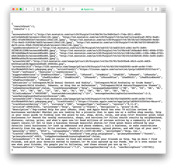 代码里可以看出来,我们在这里提交的是一个 AJAX 请求给 iTunes API. 还记得我们在前面提到过,iTunes API 有一个 lookup 的链接,我们可以通过点击该链接拿到想要的信息。 该返回信息是用如下的格式:http://itunes.apple.com/lookup?id=***. 后面这串数字就是您想要得到的应用的 ID。 API 给了我们一个 Yelp 应用的例子: https://itunes.apple.com/lookup?id=284910350. 把这个链接输入您的浏览器,会得到一段 JSON代码如下所示: