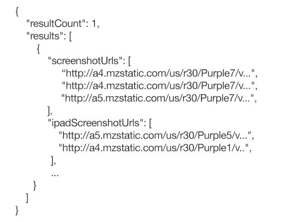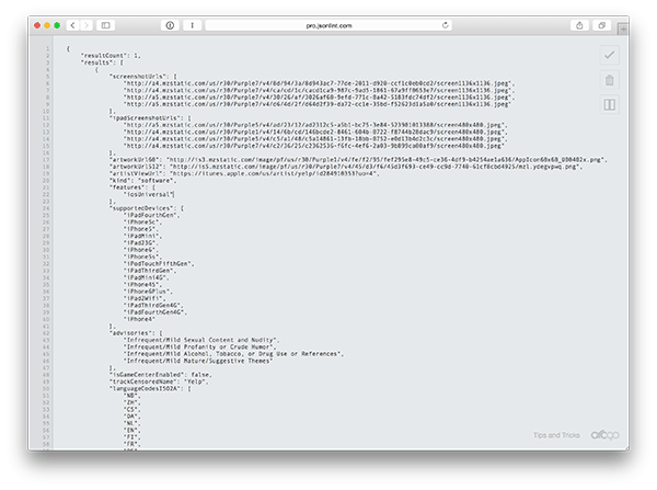 如同您所见: API返回了一大堆 APP 的详细信息: 名字,开发者,描述,类别,价格,以及其它。 我们其实真正需要的很少,就是该应用的图标。 所以我们就来查看一下这些返回的信息里是否有我们需要的。