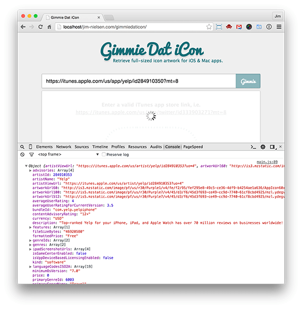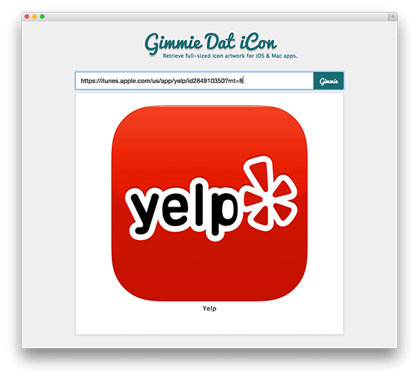 打开应用,输入示例的链接地址:https://itunes.apple.com/us/app/yelp/id284910350?mt=8 您就会得到一个很漂亮的图标文件在浏览器里。
