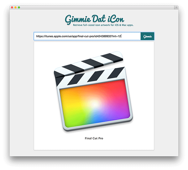 查看 API 的帮助文档,您会注意到该 API可以提供在iTunes商品里的各种内容的返回值:从音乐到电影到应用程序。 这对我们很有用,表明我们的这个小程序就不仅仅可以获得移动应用的图标了,同时也可以得到所有MAC系统的应用图标!Mac 系统的图标所用到的链接地址和 iOS 的应用类型是一样的。 例如: FCP 的链接如下所示: https://itunes.apple.com/us/app/final-cut-pro/id424389933?mt=12. 我们很熟悉的格式了,以 http://itunes 开头, 同时里面包含该应用的 ID信息了,这些都是我们需要的。
