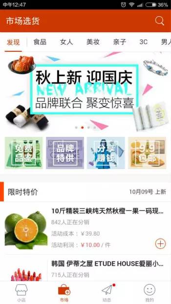 微分销是什么概念?前文说了,微盟的模式是帮助企业搭建微商城,但这种模式的一个重大瓶颈在于,微盟只是个工具提供方,可以搭建一个商城,但没办法帮助商家带来流量、获取订单,所以很多微商城容易成为“形象工程”,没有实际业绩。于是,启动微信分销显得尤为必要。今年3月,微盟正式上线“V店”(后改名萌店),产品功能上类似口袋购物微店,但不同的是其有一个分销市场,个人店主可以在其分销市场选品、上架到自己的店铺。