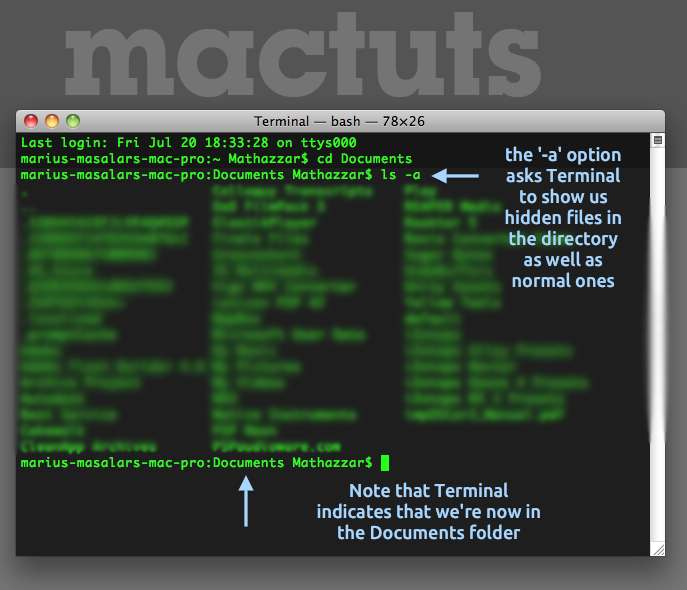 显示出当前路径下的所有隐藏文件一定是您经常需要操作的,现在您知道了一个比在 Finder 里实现该功能更快的方式了!更好的是,现在您了解了终端命令的基本格式:一条命令后面跟着可选的参数,最后是命令的变量。