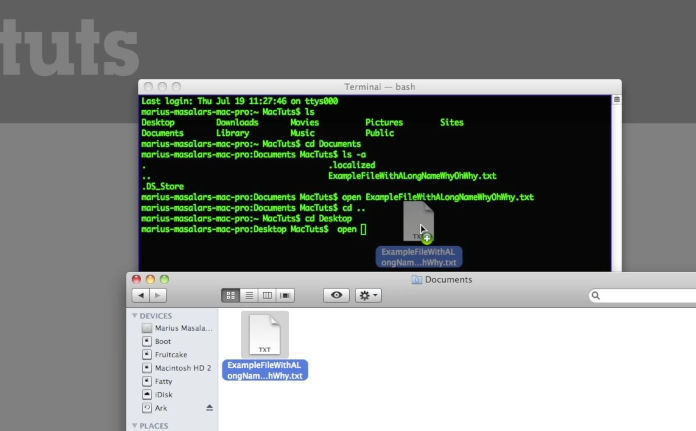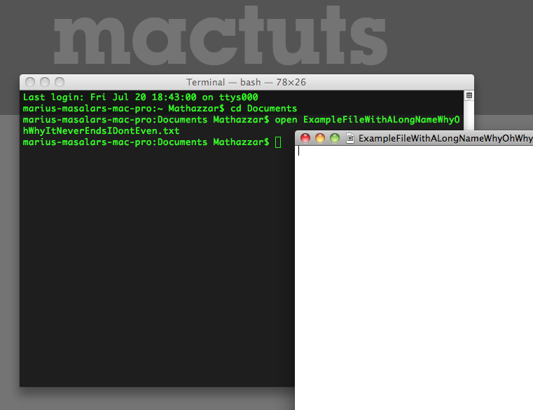 举例说,现在在文稿文件夹里看到一个文件,我们想对此进行修改。打开他,您只要输入 ‘open’ 命令,后面带上该文件的名字即可。 如果文件的名字很长,您并不想把全部内容都手输, 也可以使用终端所带的功能自动匹配文件名的功能,该功能很简单,先输入文件的首字母后,然后按 Tab 键,让系统自动完成文件名的输入。 我打算找开的这个文件名字叫做: ‘ExampleFileWithALongNameWhyOhWhyItNeverEndsIDontEven.txt’: