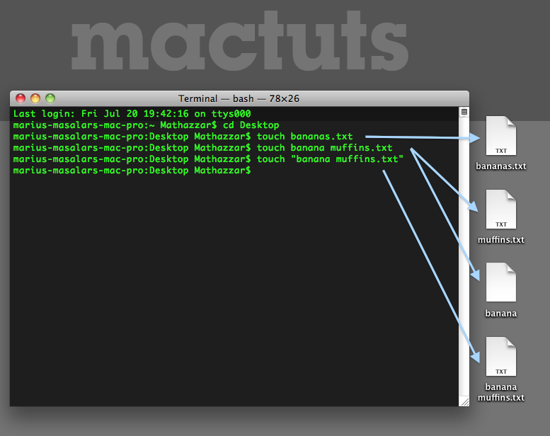 您会看到,按照上面我们所想的输入到命令行里,那么您会在桌面得到两个文件。终端把这个命令解析成为您想分别创建两个文件:一个文件名为 “banana”,另一个文件名字为 “muffins.txt”. 这也告诉我们了终端可以使用这一条命令快速的创建多个文件。 要讲清楚这个问题,让我们再次使用这个命令,这次我们把文件名用双引号给括起来: ‘touch “banana muffins.txt”’.