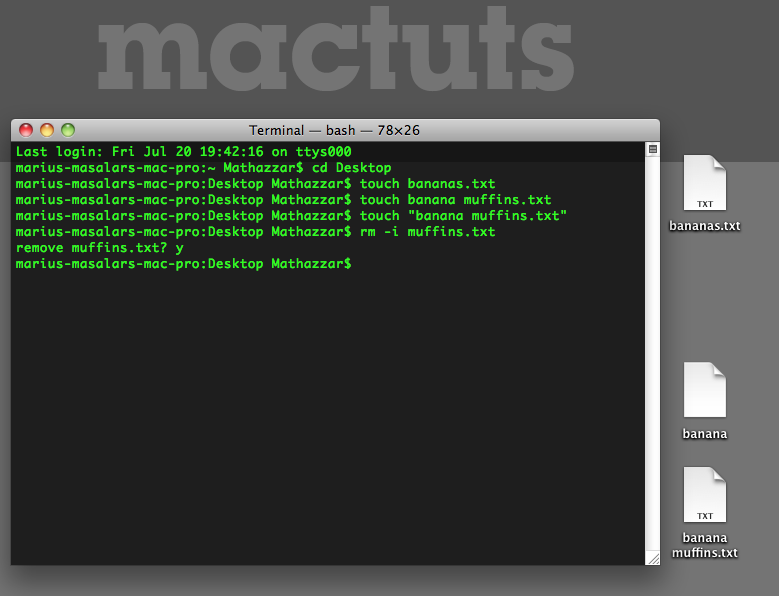 首先让我们试着删除那个孤零零的存在桌面上的文件 “muffins.txt”. 命令非常简单 ‘rm muffins.txt’. 为了安全起见,您也可以加一个参数 ‘-i’ 以启动交互模式,该参数会在执行命令之前弹出一条确认信息,比方本例中,终端会发出一条信息 “remove muffins.txt?” 如果我们确认那就直接输入 ‘yes’ 或者是简单的输入 ‘y’来确认命令执行。