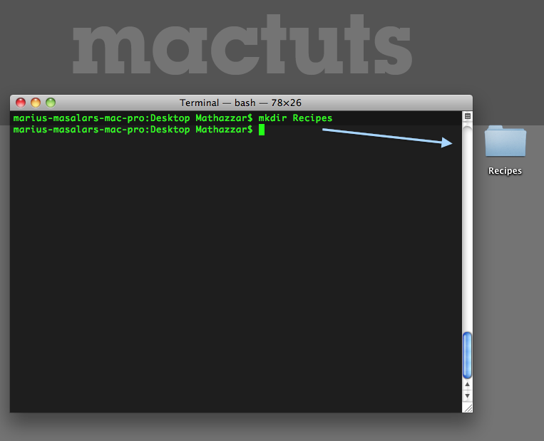 现在我们需要把以前创建好的菜谱移到这个新的文件夹内,用以前的知识那就是我们把原来的文件拷贝到新的目录下,然后删除原始的文件。现在我们可以用一个新的命令把这两步都完成了: ‘mv “banana muffins.doc” /Users/MacTuts/Documents/Recipes/’
