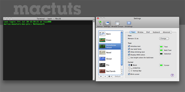 欢迎来到终端,这个系统自带的色彩方案看起来还是很绝妙干练的。当然如果您对这个色彩方案以及窗口的大小都不满意,那就可以到系统预置功能里,很简单的做调整。当您做这些事情的时候,如果一直能象黑客那般操作电脑的感觉肯定是最酷的,所以此时您完全可以通过按 “Command + ,” 来打开预置页面,在设置栏下,您可以选择不同的主题系列(或定制自己比较心水的内容) 。